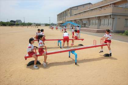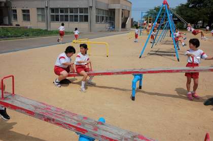 シーソーで仲よく遊んでいました。 おしりが割れないように…。
