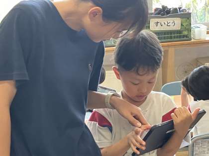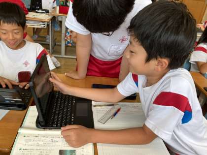 修飾語を使って、様子が詳しく分かる文を作ります。タブレットを使って文を書き、みんなで互いの文を読み合います。