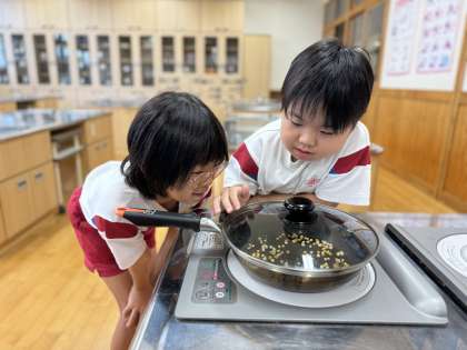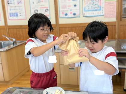 たんぽぽ・さくら・こすもす学級では、学校の畑で自分たちで育てたポップコーントウモロコシを使って、ポップコーン屋さんを開くために準備をしています。おいしいポップコーンができあがるように、3人で協力して活動しました。