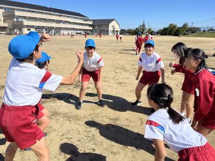 体育では今日からティーボールを行っています。ルールを確認し、各チームでファイトコールを決めました。チームワークとやる気が上がるファイトコールを各チーム工夫して考えていました。