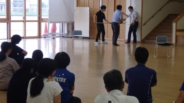 放課後には、砺波警察署の方を招いて、不審者が侵入した場合の対処法を学びました。