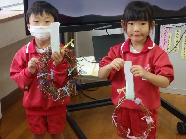 アサガオのつるで作るリースが、いよいよ完成しそうです。お気に入りの飾りを付けて、素敵なリースになりました。