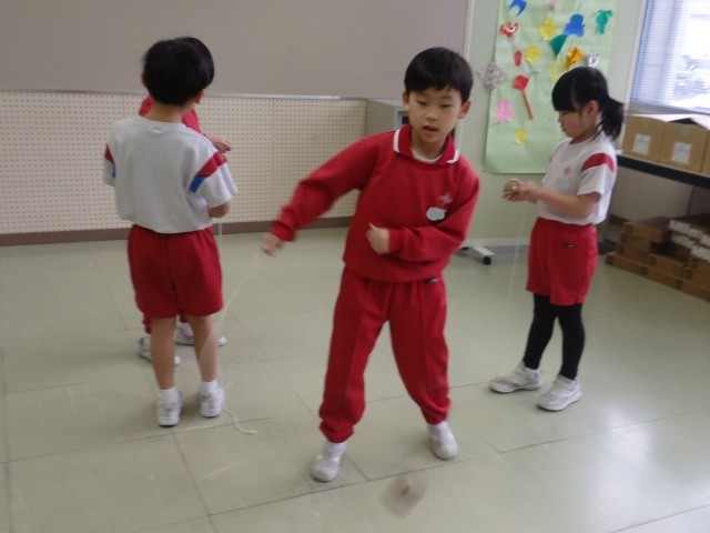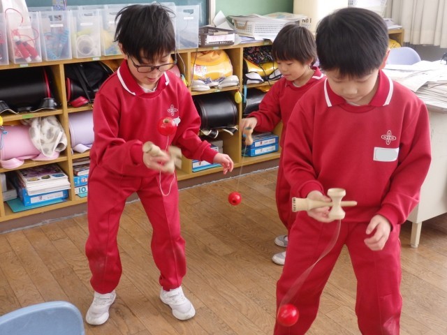 むかしから伝わる、けん玉やこままわしに挑戦しました。
