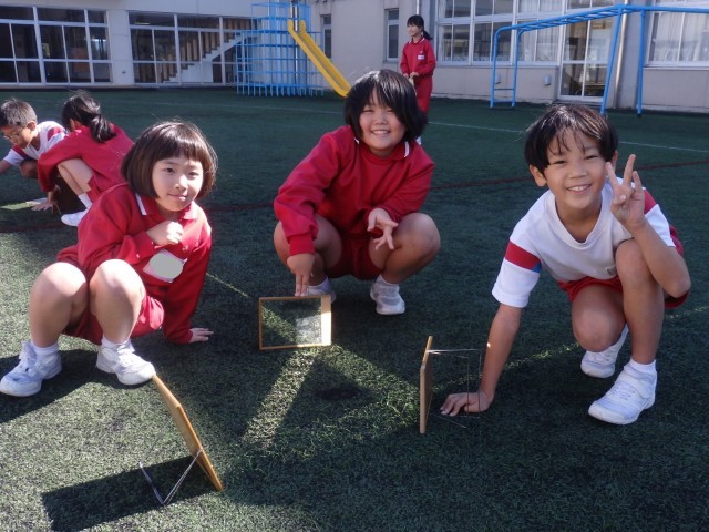 実験しながら光の性質をとらえた子供たちの手によって、中庭に、光のトライアングルができあがりました。