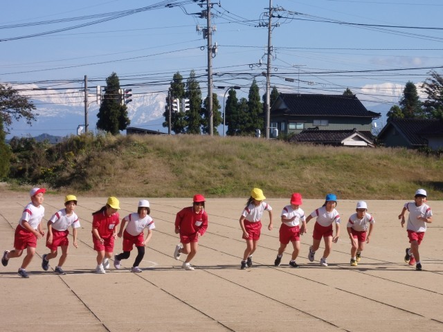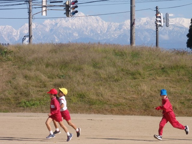 冠雪の立山連峰が美しい姿をあらわす中で、持久走に挑戦しました。