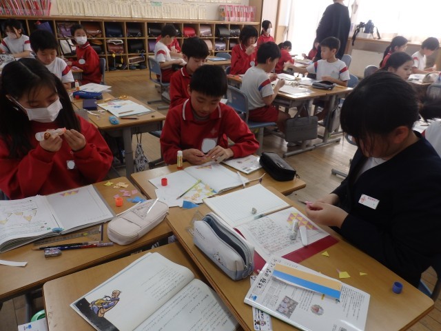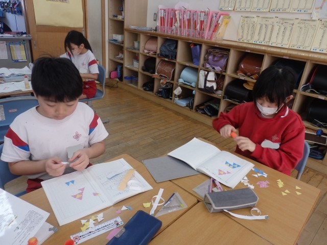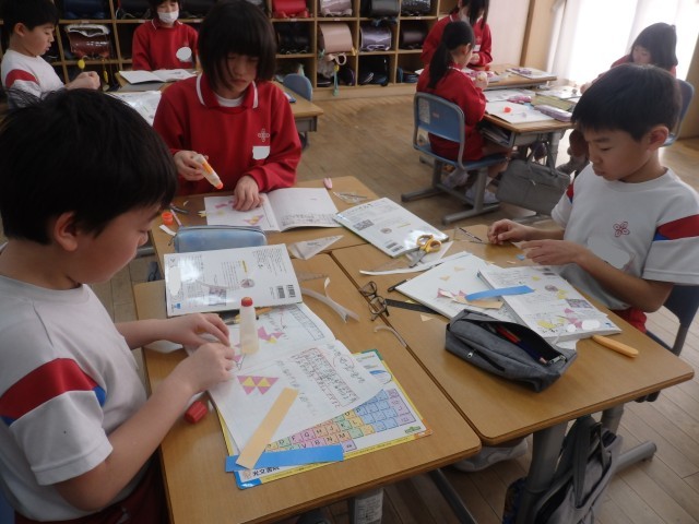 学年みんなで役割を分担して、6年生へのプレゼントづくりをしています。一つ一つ、心を込めて仕上げます。