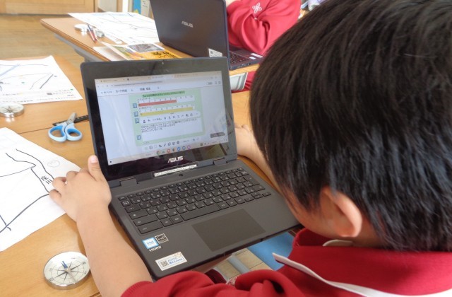社会科の時間に学校のまわりの様子を調べています。