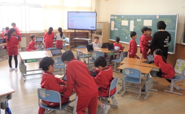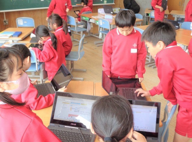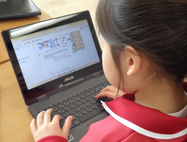 タブレットを使って自分の考えをまとめ、友達と交流しながら学びを進めています。