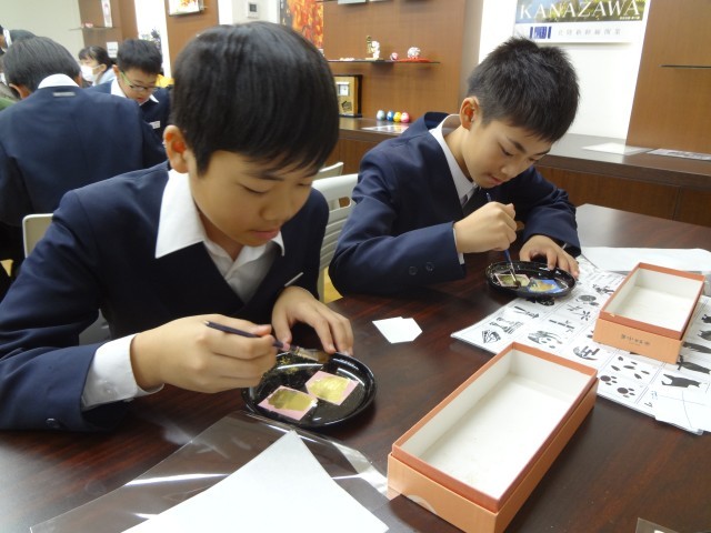 石川県歴史博物館、県立美術館、兼六園、金沢城公園で見学しました。それから、しめ太鼓、金箔貼り、加賀八幡起上りから希望したものづくり体験も体験し、歴史や文化にふれる貴重な機会となりました。
