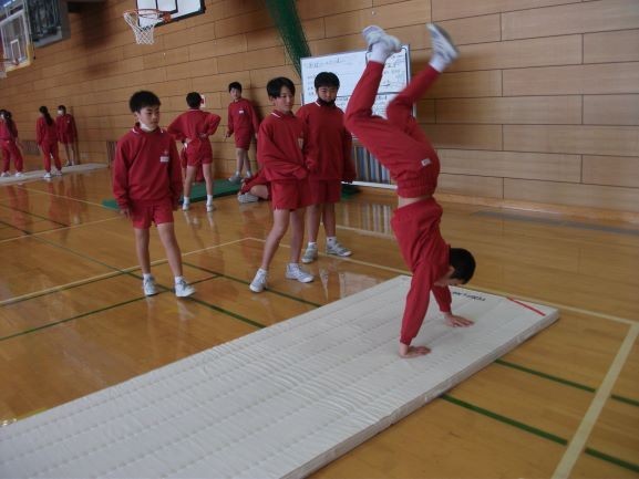 マット運動では、連続技に取り組むために前転・後転や倒立系の技を一つ一つ丁寧に練習しています。前回よりもレベルアップするために、今日は何を課題にして取り組もうかな?