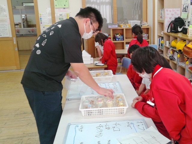 休み時間、すみれ1組のみんなで準備したお店に先生や友達を招待しました。