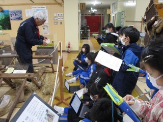 3年生の子供たちが、社会科の学習で「民具館」と「散居村ミュージアム」を訪れました。民具館では、昔の米作りに欠かせなかった「千歯こき」や「足踏み脱穀機」の実演を見学。初めて見る道具の様子に、みんな興味津々でした。さらに、実際に「わらじ」を履いたり、「石臼」を挽いたりと、体験活動にも挑戦!