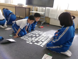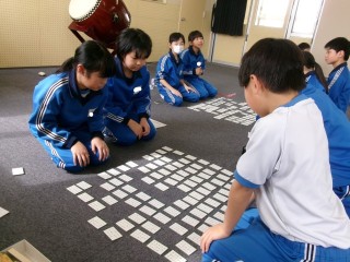 百人一首大会をしました。「〇〇さんに負けないようにがんばる」「○枚以上取る」などの目標を立てて取り組んだ子供たち。練習のときよりも上の句を読むだけで札をとることができる子供や、真剣に札の場所を覚えようとする子供が増えていました。自主学習等で、努力したことがよく伝わってきました。対戦終了後には、「去年よりとれる枚数が増えたよ」「去年より早く札をさがすことができた」と話す姿が見られ、去年よりレベルアップしたことを実感した子供が多かったようでした。これからも、百人一首に親しんでほしいです。