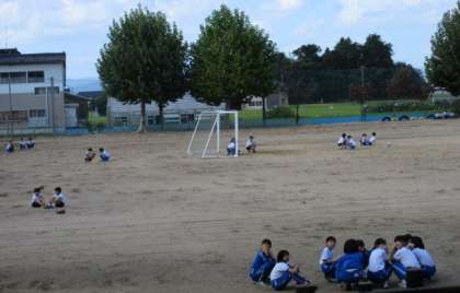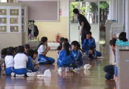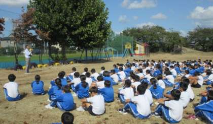 昼休みに避難訓練を行いました。休み時間に子供たちだけで避難する訓練です。非常ベルの音を聞いた子供たちは、動きを止めて、その場にしゃがみ、静かに放送を聞いていました。その後、上の学年の子供たちが先頭になってグラウンドへ避難しました。