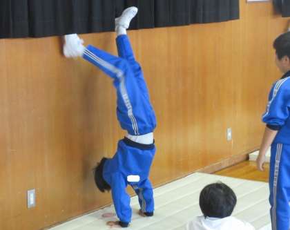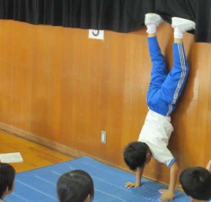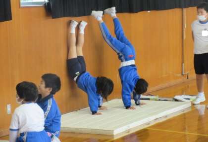 3年生は、体育科でマット運動に取り組んでいます。今日は、とう立に挑戦!子供たちは、互いに感じたポイントやコツを教え合いながら、何度も「かべのぼりとう立」や「かべとう立」にチャレンジしました。少しずつできる子が増えてきました。