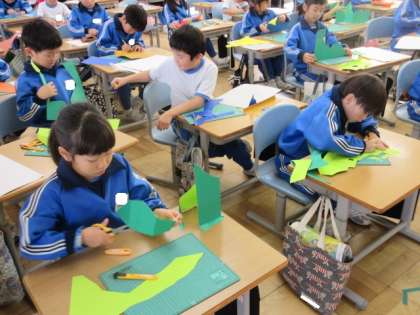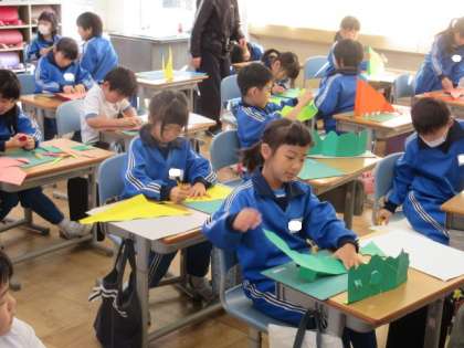 2年生は、図画工作科でカッターナイフやはさみを使って紙を切り、「まどのあるたてもの」を作っています。子供たちは、上手に紙を切ったり折り目をつけたりして、楽しみながら取り組んでいました。どんな建物になるか、完成が楽しみです。