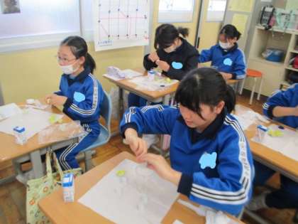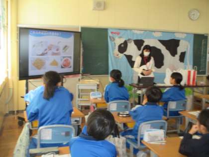 4年生は、株式会社明治の栄養士さんなど3名の方から、ヨーグルトや乳酸菌についていろいろ教わりました。乳酸菌の働きで、牛乳がヨーグルトに代わると味が変わっておいしくなったり、日持ちがするようになったり、運びやすくなったり、栄養素が増えたりと良いことがたくさんあることをクイズ形式で学びました。学習の最後には、牛乳にレモン汁とガムシロップを混ぜて、レモン味ヨーグルトラッシーを作りました。レモン汁を入れたらすぐに固まり始める牛乳に、子供たちは驚いていました。