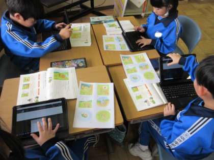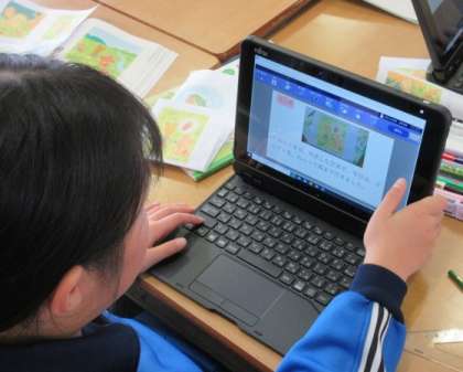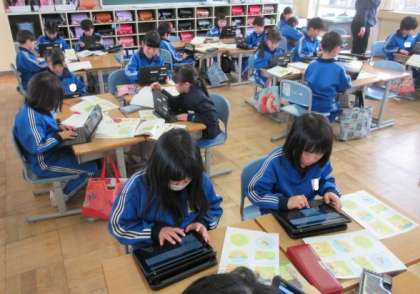2年生は、国語科で絵を見てお話を考える学習に取り組んでいます。今日は、「初め」「中」「終わり」を意識して、おおまかなあらすじを考え、考えたことをタブレットに表しました。あらすじを考えるのを楽しんでいる様子でした。