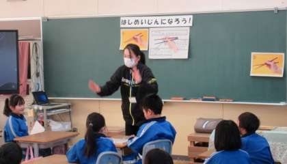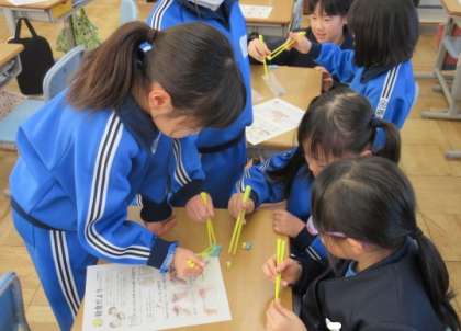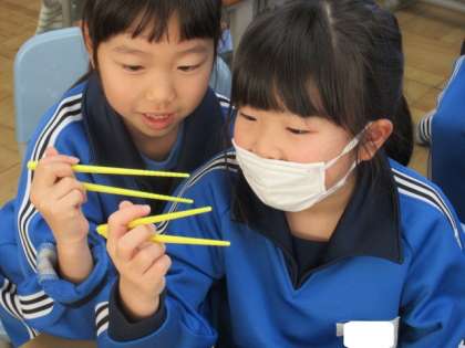 2年生は、砺波市給食センターの栄養教諭に、正しいはしの持ち方を教わりました。「上のはしの持ち方」や「下のはしの支え方」に気をつけて、友達と一緒に何度も練習しました。給食の時間には、学んだことを生かし、正しいはしの持ち方を意識して食事をとる様子がみられました。