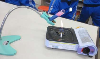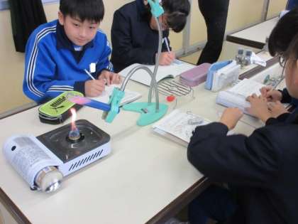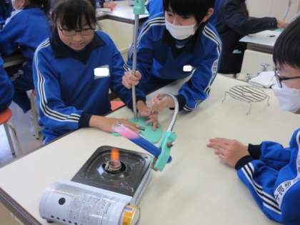 4年生は、理科で「水のあたたまり方」を学習しています。今日は、温度によって色が変化する示温インクが入った試験管の上部を温めると、どのようにあたたまるのか調べました。器具を正しく扱いながら、グループのみんなで協力して、実験・観察を進めることができました。