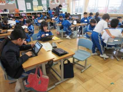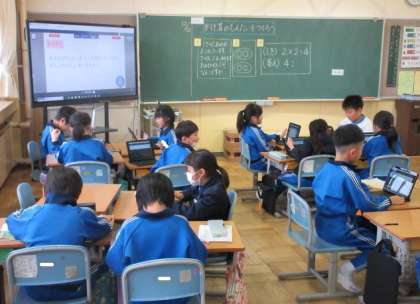 2年生は、算数科でかけ算の問題作りに取り組みました。タブレットに問題の文章を打ち込んだり、問題の状況を図に表したりしました。問題に担任の先生を登場させたり、友達とアイディアを出し合ったりして、問題作りを楽しんでいました。