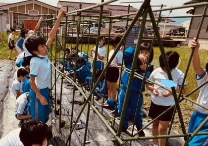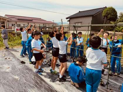 教室で育ててきたヘチマの苗を、畑に植え替えることにしました。1人1人の苗がどれだけ成長したかが分かるように、1人1本の支柱が用意されています。また、重さで支柱が倒れないように、十分に補強して棚が作ってあります。植え替えた苗に丁寧に水をかける子供たちの姿がたくさんありました。苗は、いったい何メートルまで伸びるのでしょうか?楽しみです。
