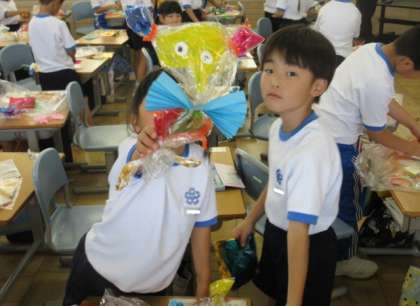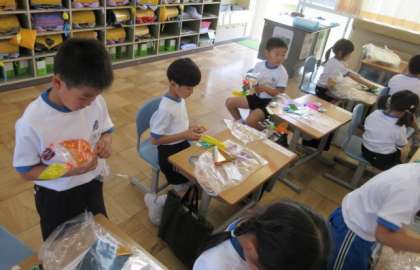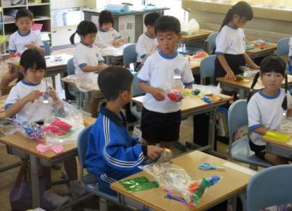 図画工作科で、カラーセロハンやモールを使って、ひとや生き物を作りました。自分のイメージに合うように、何度も重ねたり組み合わせたりするなど、いろいろと試しながら作りました。