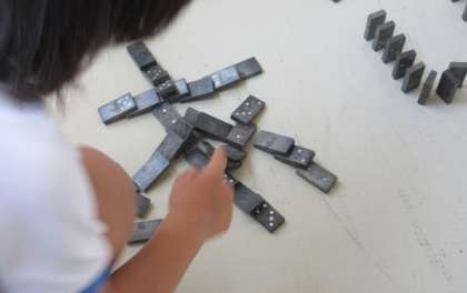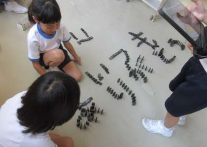 休み時間に、ドミノを使って遊ぶ様子です。7月28日(日)に、創立40周年記念行事として「ドミノ倒しに挑戦」が予定されています。子供たちは、少しずつドミノを並べることに慣れてきたようです。友達と一緒に楽しんでいる姿がたくさん見られました。