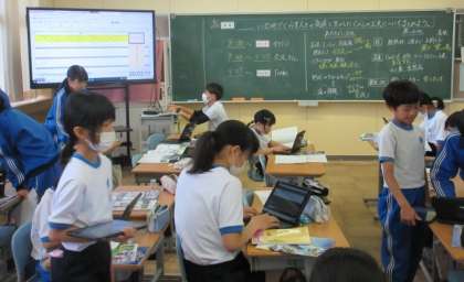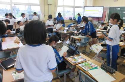 社会科で、あたたかい土地や寒い土地などそれぞれが住む地域の気候を生かしたくらしの工夫について調べました。調べたことをタブレットでまとめ、互いに交流しました。友達と交流することで、多くの子供たちが新たな工夫に気付いたようでした。