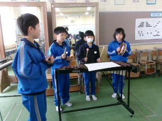 4年生の音楽の学習では、<タンブリン><カスタネット><木琴><鉄琴>等の楽器の音に注目して組み合わせ、グループで音楽を作っています。「鈴は手首を叩く鳴らし方と振る鳴らし方があるよね」「鉄琴の音の高さを変えて表してみようよ」などと話しながら音の鳴らし方を工夫することで、音楽室には様々な音楽が響いています。次回の発表会でどんな音楽が聞けるか楽しみです。