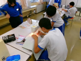 6年生の子供たちは、家庭科『思いを形にして~生活を豊かに~』の学習において、<エコバック><トートバック><ナップサック>の3つの中から、自分が日常生活で利用したいものを選んで製作しています。子供たちは、昨年度、5年生の時に<エプロン>の製作に取り組んだ経験を活かして、作業手順の説明書を読み解きながら、どんどん作業を進めていました。マチ針の使い方をタブレット型端末で調べたり、友達とミシンの使い方を確認したりしながら作業を行う子供たちの姿から、オリジナルのバックを早く完成させたいという思いが伝わってきました。どんな仕上がりになるのか楽しみです。