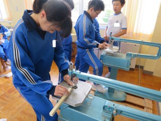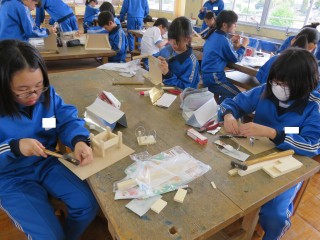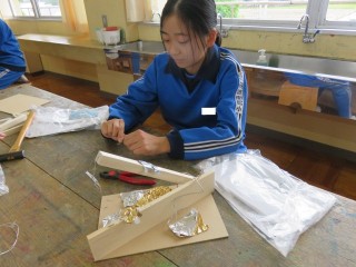 工作の学習です。今まで使い方を学習した<糸のこぎり>や<かなづち><ペンチ>等を使い、金属と木を組み合わせて飾りを作っています。小物入れや物を引っかけるフックを作るなど、飾りとしてだけでなく、利用することも加えて考えている子供もいます。どんな作品になるか楽しみです。作品は、11月の学習参観で展示する予定です。