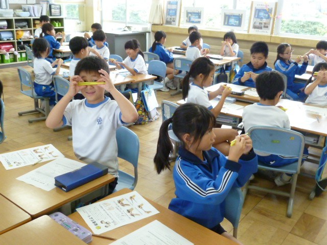 砺波市学校給食センターの杉浦栄養教諭に、正しい箸の持ち方について教えていただきました。「めざせ!はし名人」というワークシートを、レベル1から5まで挑戦することで、箸名人に近づきます。まずは、箸1本で鉛筆の持ち方に挑戦しました。「ぼくは、鉛筆の持ち方上手だから大丈夫」と言いながら、「中指まくら」にしてやってみました。最後は正しい持ち方でスポンジや消しゴムをつまんでみることに挑戦しました。箸を正しく持てると、お茶碗のご飯粒まできれいに取れるようになって、片付け名人にもなれると教えていただきました。その後の給食でも正しく箸を持つことを心がけていました。