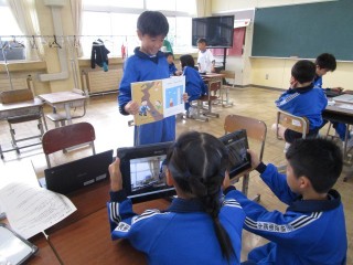 3年生の子供たちは、国語科で1年生に読み聞かせる本や読み聞かせの仕方について話し合う学習をしています。今日は、みんなで話し合ったことを基に、実際に読み聞かせの練習をしました。登場人物ごとに役割を決めて表現の仕方をじっくり考えるグループ、自分たちの読み聞かせを動画に撮影しながら練習するグループ等、自分たちの目当てに合った学び方で練習をしている姿が見られました。1年生に読み聞かせをするのが楽しみです。