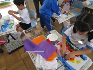 図画工作科『ふわっと ぎゅっと おはながみのえ』の学習に取り組みました。子供たちは、「ふわっと」丸めたり、「ぎゅっと」にぎったりねじったりと、お花紙の形を変えて、それぞれの形の組み合わせを工夫しました。