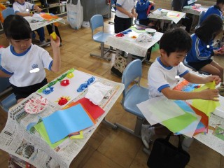 「ふわっとすると、お花みたい!」「ぎゅっとしたら、おにぎりみたいになった!」と、感じたことを口にしながら、形の変化を楽しむ姿がたくさん見られました。できあがった形を画用紙に貼る時には、「集めたら森みたい!」「お花畑にしよう!」と、友達と相談しながら工夫する姿も見られました。教室いっぱいにおはながみの世界が広がりました。