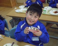 1年生になってたくさんお世話になった机をひっくり返してぞうきんで拭いています。かなり重い机ですが、とても上手に扱っています。