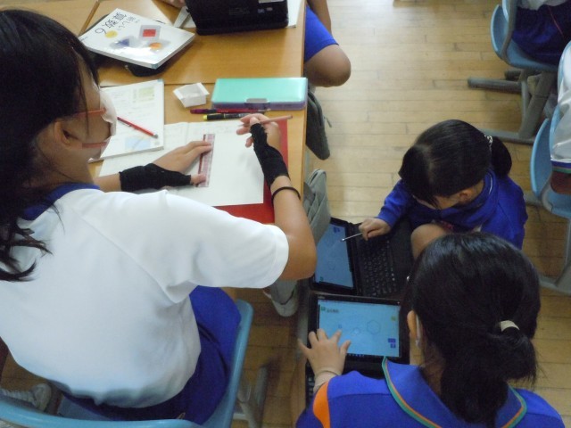 算数の時間です。今まで学習してきた図形が、必ず拡大図、縮図の関係になっているかどうか調べています。根拠を述べて「必ず」といえることが難しいようです。