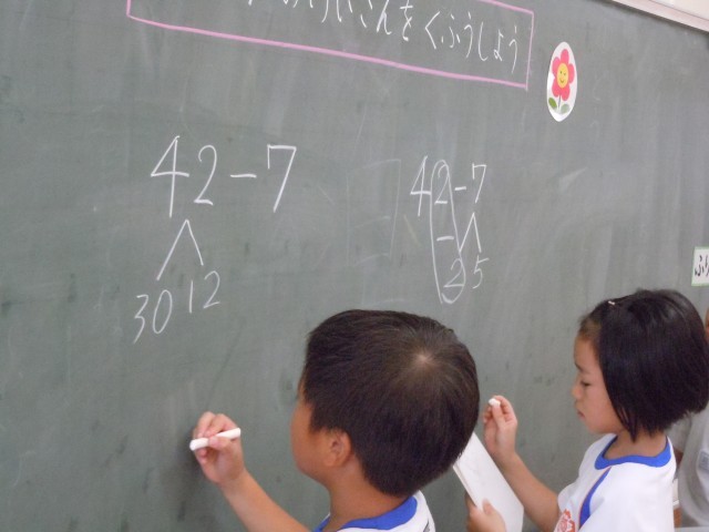 算数の時間です。「42-7」を考えています。学習したことを使えないかどうかとヒントをもらうと、ひらめいたように動き始めました。