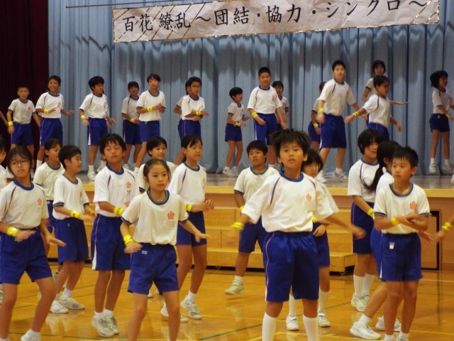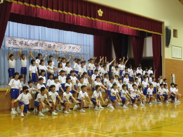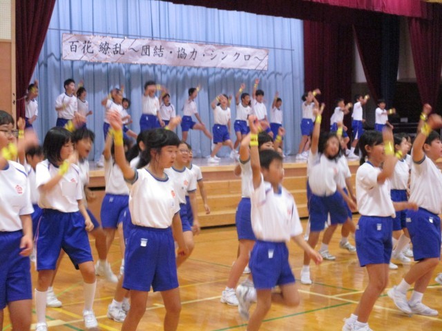 5年生の発表「百花繚乱 ~団結・協力・シンクロ~」の様子です。