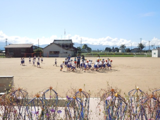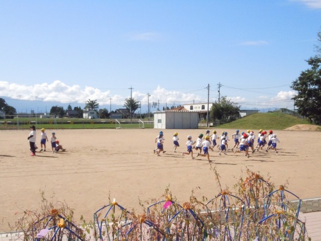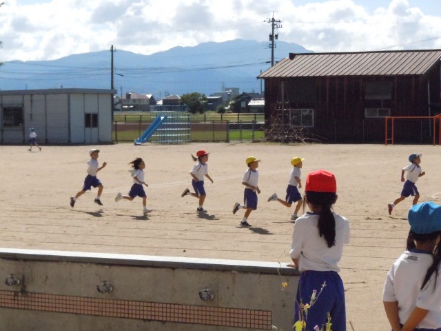 体育の時間です。来月末に予定されているランニング大会を目指して、長い距離を走っています。1年生にとって、長い距離を歩かずに走るペース配分が難しいようです。