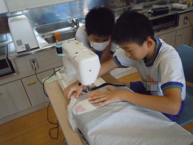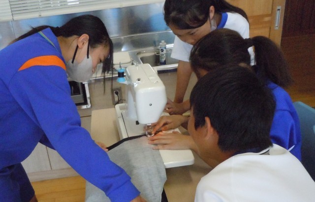 家庭科の時間です。ミシンでエプロンを縫っています。ミシンの調子がよくなくて集まっているのか、友達のミシン掛けが気になって覗き込んでいるのか、集まりがちです。