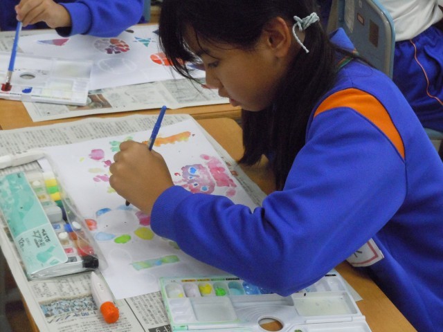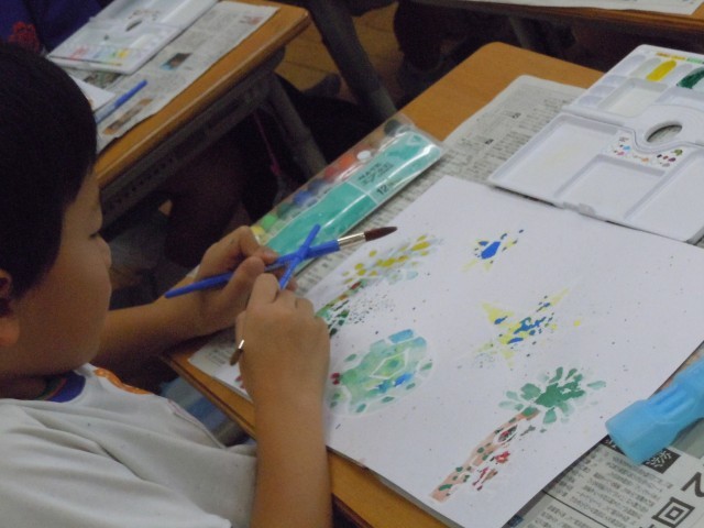 図画工作の時間です。久しぶりに「にじんで広がるものがたり」の続きをしています。絵具の混色と水加減が分かってきて、にじみの美しさ、面白さを味わっているようです。