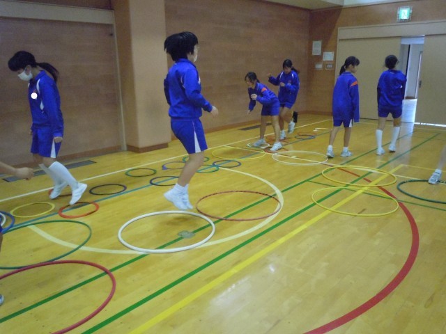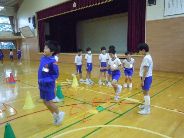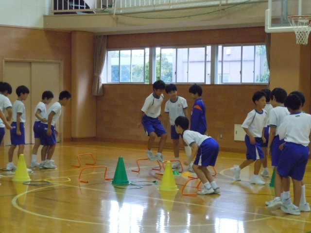 体育の時間です。用具を使って体を動かすコースづくりをして、実際に動いています。