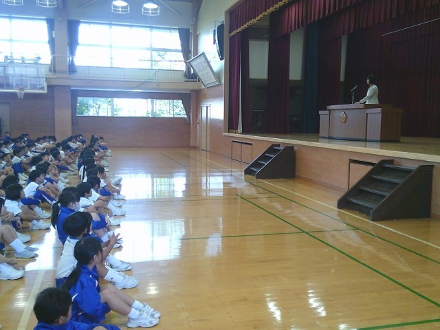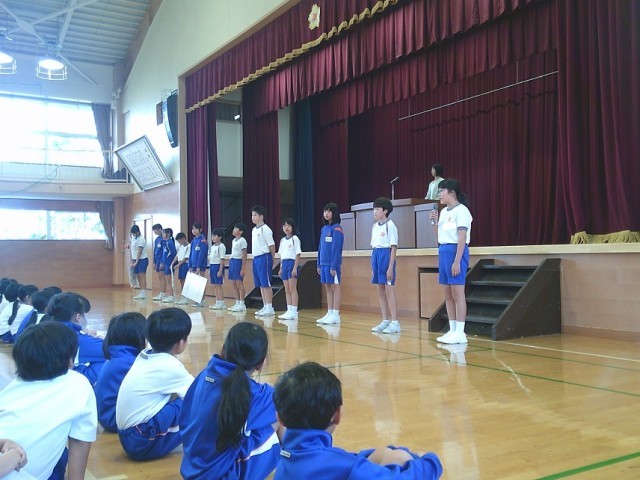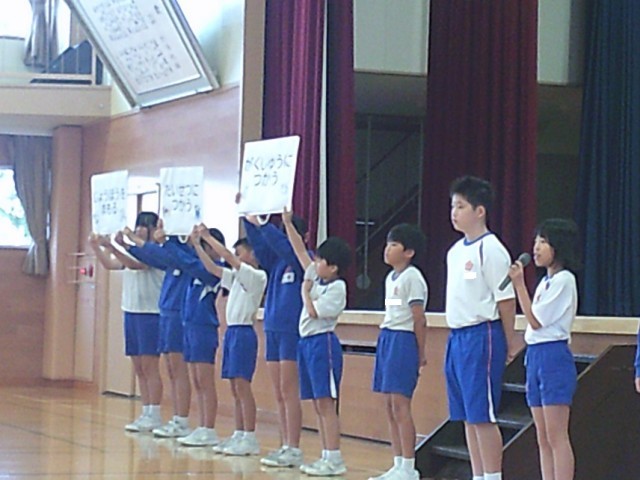 情報委員がタブレット使用の約束を、全校児童に伝えました。