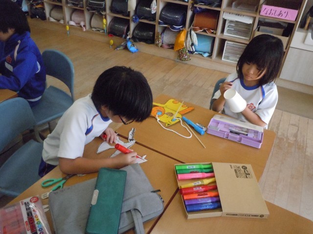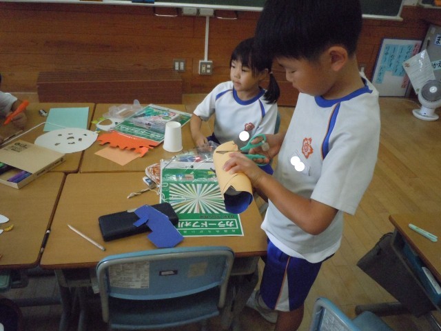 図画工作の時間です。「紙けん玉」をつくっています。平らな紙でつくり、遊びを楽しんだ子供たちは、紙コップで次の紙けん玉にも挑戦し始めました。