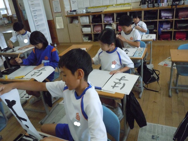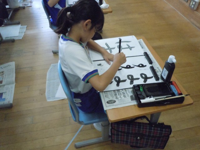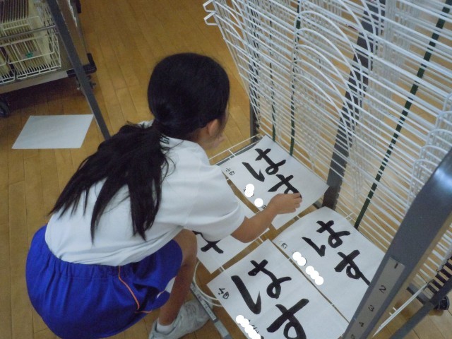 書写の時間です。ひらがなで「はす」と書いています。ひらがなの筆使いを練習しています。