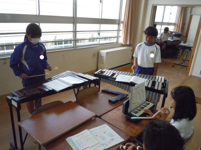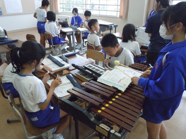 音楽の時間です。グループで合奏しています。お互いの音を聞きながら演奏しようと一生懸命です。