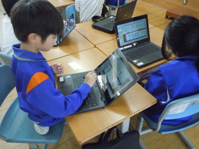 国語の時間です。「ちいちゃんのかげおくり」を読み進めています。一の場面と四の場面のかげおくりをくらべています。デジタル教科書を使っているので、上下に並べて読み込んでいます。