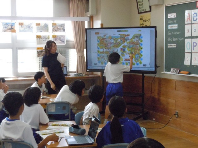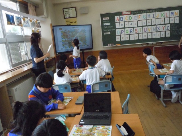 外国語活動の時間です。大文字と小文字を比べています。そういえば、前のタブレットは大文字で今のタブレットは小文字のキーボードです。ある程度は、身に付いているようです。